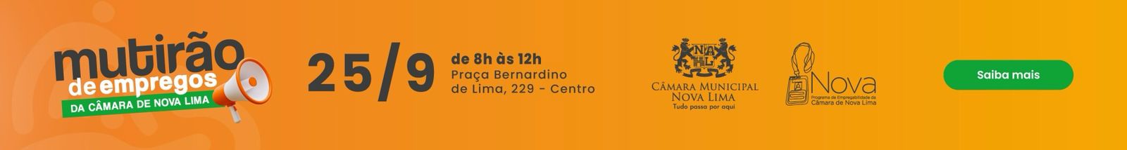 A Câmara Municipal de Nova Lima, por meio do Núcleo de Oportunidade e Valorização Ativa (NOVA), promove na quinta-feira (25), das 8h às 12h, mais uma edição do mutirão de empregos, desta vez no plenário da Casa Legislativa.