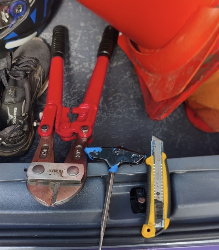 Eles estavam próximos de uma motocicleta, e em posse de um alicate, usado em crimes para cortar acessórios e outros objetos para cometimento de crimes. Havia sinais de tentativa de arrombamento.