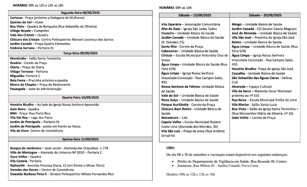 A Prefeitura de Nova Lima inicia no dia 8 de setembro, a vacinação de cães e gatos contra a raiva, de modo itinerante, passando por 66 pontos distribuídos pela cidade, ao longo de todo o mês.